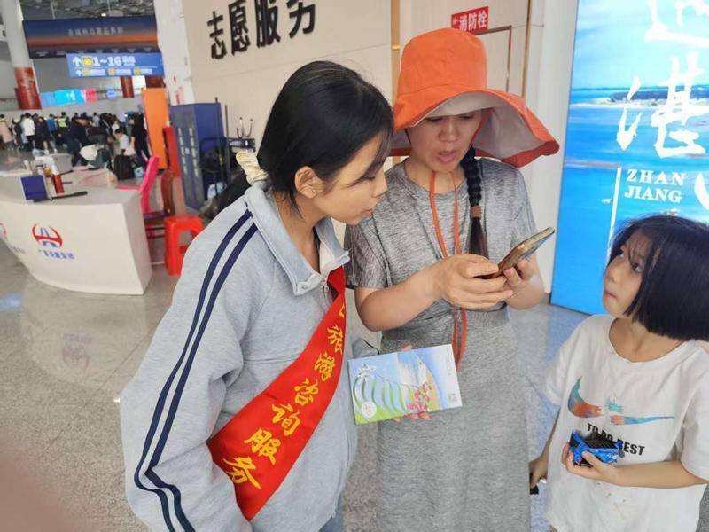 文化暖场之外,服务更显细致。在徐闻港大厅一角,海南旅游咨询服务点前人头攒动。工作人员递上旅游手册,耐心解答住宿、路线等问题,桌上还备有充电宝、热水壶、应急药品等便民物资。
